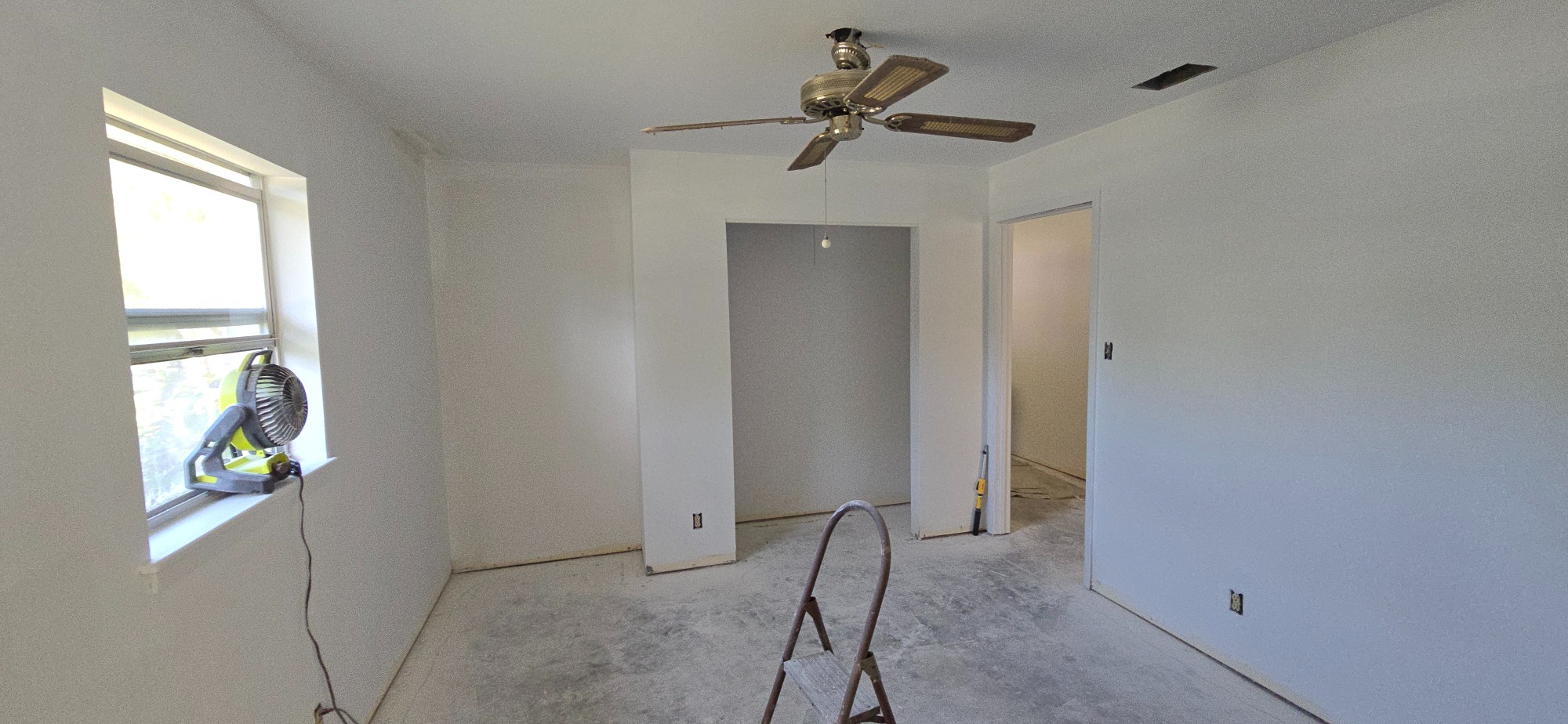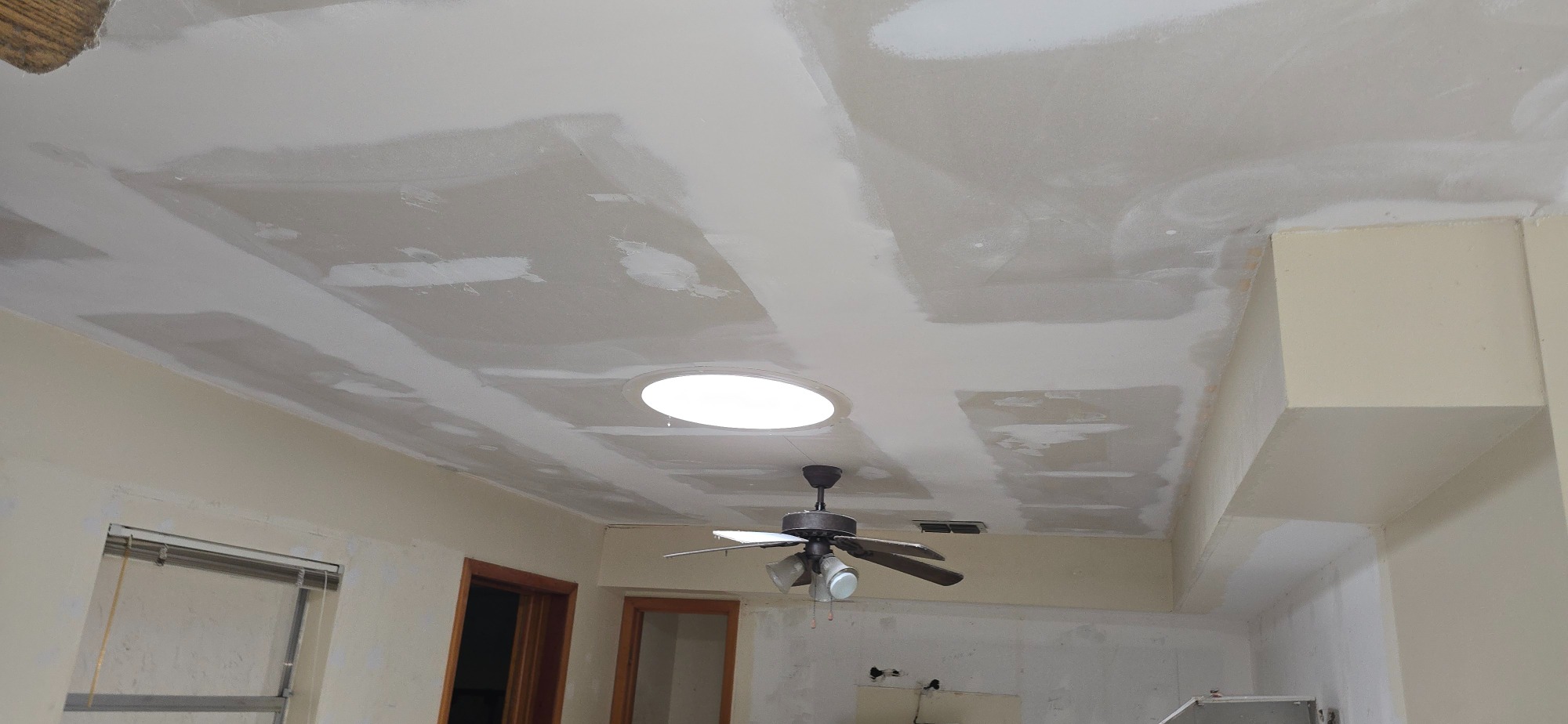 Given the unpainted nature of the existing ceilings, we employed a water-spray technique to effectively soften and remove the textured material. Subsequently, we applied a uniform skim coat of drywall compound across the entire ceiling surface. This was followed by a rigorous sanding process to achieve a perfectly smooth, drywall-like finish.